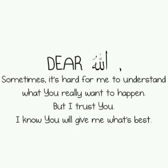الله ku, ajari aku mencintainya karena Engkau. bukan karena nafsu dunia. Karena sesungguhnya Engkau telah menjadikan manusia berpasang-pasang. aku yakin Engkau telah menyiapkan seseorang untukku kelak. Jika sekarang aku menyukainya, ajari aku untuk menjaga perasaan ini. ajari aku untuk tidak berlebihan. ajari aku untuk menjaga hati. Engkau akan mempertemukan lelaki yang baik dengan wanita yang baik. الله ku, jika dia memang untukku, jagalah dia untukku dan jagalah aku untukknya ♥ dan jika dia bukan untukku ikhlaskan aku. karena Enkau yang Maha Mengetahui segala sesuatu. آمين